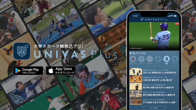 UNIVAS に加盟する29競技以上の試合映像が視聴可能な大学スポーツファン向けアプリです。6,000 本以上の大学スポーツの試合映像を保有しており、試合映像のライブ配信やアーカイブ映像の一部が無料でお楽しみいただけます。昨年10 月には「UNIVAS Plus プレミアムプラン」がスタートし、ご加入をいただくと複数試合が同時にライブ観戦できるマルチビュー機能や1試合を複数の視点で観戦できるマルチアングル機能、PC の大画面で視聴できるマルチデバイス機能、過去の試合のアーカイブ映像が見放題となるサービスが付与され、新たな視聴体験を楽しむことができます。
