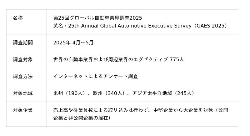 KPMGジャパン(東京都千代田区、共同チェアマン:山田 裕行、知野 雅彦)は、「第25回KPMGグローバル自動車業界調査2025(日本版)および第4回日本における消費者調査」を発表しました。本レポートでは、KPMGが日本を含む世界の自動車業界のエグゼクティブを対象に実施したグローバル調査に、KPMGジャパンが日本国内の消費者を対象に実施した調査結果を加味し、自動車業界の展望を多角的に検証しています。