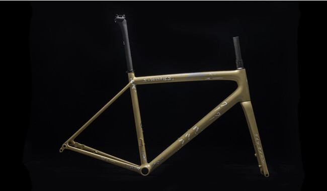 Aethos(エートス)とは、複数のプロチームをサポートし、近年のレースシーンにおいて最も存在感を示しているスペシャライズドが、レース用途ではなく純粋にロードライドを楽しむために開発した全く新しいロードバイクです。「Break The Rules(ルールを破れ)」をコンセプトに、自分たちで決めた過去のしきたりを自分たち自身で破り、何にも縛られない自由な発想で、ただ純粋にロードライドを楽しむべく最高の走りを求め開発しました。今回使用したフレームセットのSatin Carbon/Jet Fuel カラーは、塗装を剥がさなくてもカスタムペイントしやすいマットブラックとされ、ロゴも剥がしやすいデカールタイプとなっています。