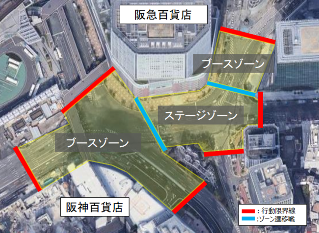 大阪・梅田にある阪神百貨店と阪急百貨店前のエリアをバーチャル空間に3Dで再現し、ステージゾーンと2つのブースゾーンを構築します。ステージゾーンでは出演者の音楽ライブを視聴することができ、ブースゾーンでは各種イベントやグッズの購入等をお楽しみいただけます。バーチャル空間のため、普段は立ち入ることができない交差点内を実際に歩いているような臨場感を体感することができる上、インターネット環境があれば、どこからでもご参加いただけます。