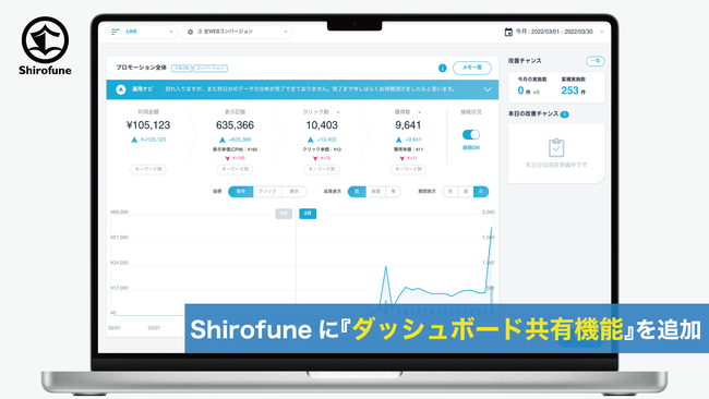 広告運用自動化ツール「Shirofune」は、統合ダッシュボード領域の新機能として、運用管理者以外の第三者でもShirofuneのコックピット画面(ダッシュボード)やレポートを閲覧専用で共有する「ダッシュボード共有機能」を新たに追加しました。