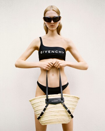 2023年、 『ジバンシィ プラージュ』は、メゾンの過去と現在のシグネチャーをフィーチャーしたコレクションで、その伝統と再び結びつきます。大胆なカットアウト、ビーチクラブの定番アイテム、セーラーストライプ、パールやピンク、チェーンモチーフ、繊細に編み込まれたマクラメなどが、センシュアルでありながらスポーティで気軽さを感じさせるシルエットにまとまっています。ジバンシィが誇る、タイムレスでシーズンレス、そして普遍的な魅力を持つブラックとホワイトを基調としたコレクションは、セパレートの精神に基づき、レイヤードスタイルを容易に実現するアイテムで構成されています。ユベール・ド・ジバンシィのお気に入りの素材であるリネンは、ブラックやサンドベージュのビキニやカバーアップに編み込まれ、ボブハットやラフィアトートとともに提案されます。