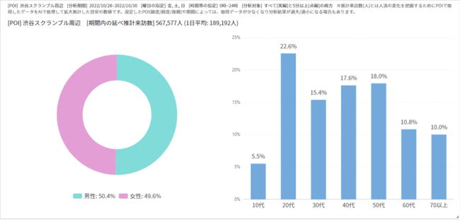 2022年10月28日(金)〜10月30日(日)の渋谷スクランブル交差点の人出の性年代別の割合は、男性が50.4%、女性が49.6%。年代別で見ると、20代が5.5%、30代が22.6%で、20代30代を合わせると、全体の3割程を占めていました。