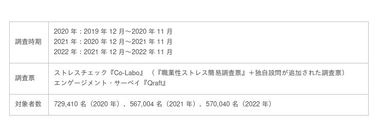 人材の“採用”から“定着”、その先の“活躍”までを支援する人材サービス事業を展開する株式会社ヒューマネージ(本社:東京都千代田区、代表取締役社長:齋藤 亮三、以下ヒューマネージ)は、企業で実施されたストレスチェックおよびエンゲージメント・サーベイの分析結果を発表した。本結果は、ヒューマネージが提供するストレスチェック『Co-Labo』、及びエンゲージメント・サーベイ『Qraft』を 2022 年に実施した約 57 万人、さらに 3 年間の経年データを対象とした計 187 万人もの大規模な分析調査の結果となる。