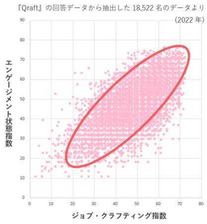 上図の通り、「ジョブ・クラフティング」と「エンゲージメント」には強い相関がみられ、ジョブ・クラフティングがエンゲージメント向上のカギであることが判明している。