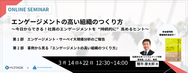企業で実施されたエンゲージメント・サーベイ『Qraft(クラフト)』の分析結果より、年代別にみられる傾向や、テレワーク 等の働き方×エンゲージメントの関係をご報告。さらに、昨今、エンゲージメントを高めるカギとして注目を集める“ジョ ブ・クラフティング”研究の第一人者 種市 康太郎氏(桜美林大学 リベラルアーツ学群 領域長(人文)、教授)より、 エンゲージメントの高い組織のつくり方について、効果的な打ち手を解説します。データと事例にもとづく、実践的なヒ ントのつまったセミナーです。