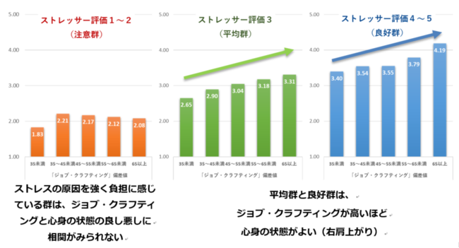 中央のグラフと右のグラフ、[ストレスの原因を平均的に負担に感じている群(平均群)]と[ストレスの原因をあまり負担 に感じていない群(良好群)]は、「ジョブ・クラフティング」が高いほど、心身の状態がよいという、正の相関がみられた。 エンゲージメントを高める特性である「ジョブ・クラフティング」が、エンゲージメントを高めるだけでなく、ストレス反応の 軽減にも効果を発揮していることが窺える。特に、[ストレスの原因をあまり負担に感じていない群(良好群)]においては、そもそも負担に感じていないためそれ以上のストレス対処が難しいが、「ジョブ・クラフティング」という新たな打ち手であれば、さらに心身の状態をよくすることが可能といえる。