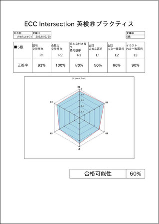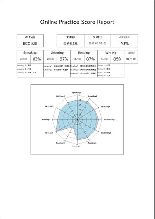 2週間後※に、演習の結果(成績)をレポート形式で、個人別に送信します。問題パート別の得点率やスコアに応じた適切な学習方法、解法のキーポイントなどが示されているので、弱点の強化に役立てることができます。