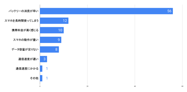 スマホの利用に関する悩みは、「バッテリーの消費が早い」が56% と多く挙げられました。