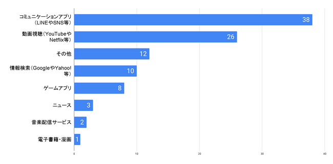 LINEやSNSを含むコミュニケーションアプリが38名と最多で、次にYouTubeやNetflix等の動画視聴が並びました。