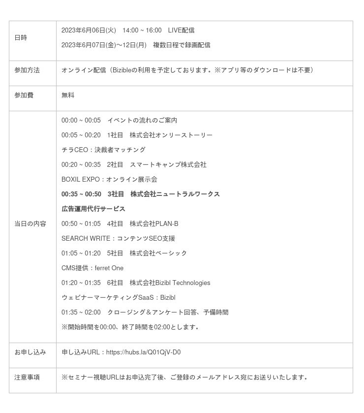株式会社ニュートラルワークス(神奈川県茅ヶ崎市 代表取締役:三木五月、以下 ニュートラルワークス)は、株式会社Bizibl Technologies(本社:大阪市北区、代表取締役:花谷燿平)主催で2023年6月6日(火)にあるLIVE配信、【マーケティングの新時代を担う必見サービス6選】新規リード獲得サミット 2023に参加することをお知らせします。