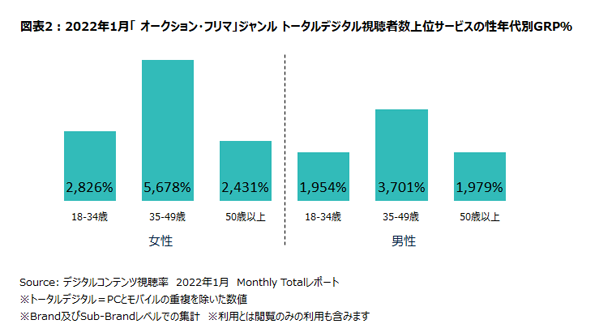 次に、「オークション・フリマ」ジャンルにおける視聴者数ランキング上位サービスを合計したターゲットGRP(TARP)を性年代別に見ると、女性35-49歳で最も高く5,678%となっていました。次いで男性35-49歳で3,701%となっていました(図表2)。性別を問わず35-49歳で高くなっており、この年齢層に利用者のボリュームゾーンがあることが分かります。