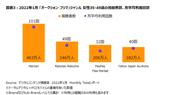 最後に、TARPが最も高かった女性35-49歳の利用状況をサービス別に見ると、視聴者数ではMercariが最も多く463万人で、Rakuten Rakumaが246万人で続いていました。さらに、平均利用回数でもMercariが月平均101回と最も多く、Rakuten Rakumaが月平均49回で続いていました(図表3)。
