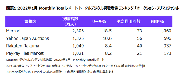 2022年1月のニールセン デジタルコンテンツ視聴率Monthly Totalレポートによると、「オークション・フリマ」ジャンルにおいて、PCとモバイルの重複を除いたトータルデジタルで最も視聴者数(2歳以上)が多かったのはMercariで2,306万人が利用しており、Yahoo Japan Auctionsが1,325万人で続いていました。また、平均利用回数でもMercariが月平均73回と最も多く、Yahoo Japan Auctionsが月平均56回で続いていました(図表1)。