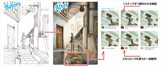 前作に加えて、新たにファンタジー世界の街の表現方法も掲載! レンガの壁、石畳、石壁の町並み、ガラス窓、石積みのブロックの描きかたの解説をプラスした、テクニック満載のコピック技法書です。また前作で画面が暗く見づらかった部分などをリファインし、より見やすくなりました。