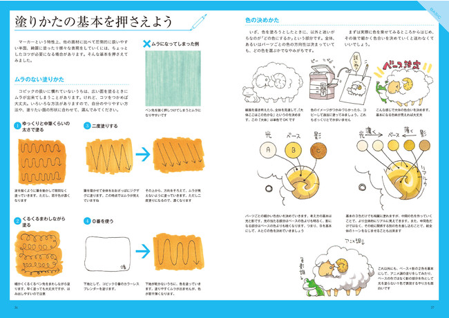 ・Basic Lesson(コピックを知ろう/コピックの色を知ろう/塗りかたの基本を押さえよう/グラデーションの塗りかた/異なる色系統のグラデーションを作る場合/グラデーションサンプル/5色で描ける質感とポイント)