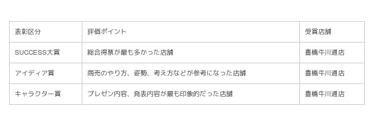 今年で2回目の開催となる本イベントでは、各エリアを代表する店舗が、成功の秘訣や新たなビジネスアイデアをプレゼンテーション形式で発表し来場者 約1,000名による投票で2014年度の入賞店舗が決定します。本年度の「SUCCESS大賞」は、MADOショップ 豊橋牛川通店(愛知県豊橋市/ティージー株式会社)に決定するとともに同店舗は来場者からの高い評価を獲得し「アイディア賞」、「キャラクター賞」にも輝きました。