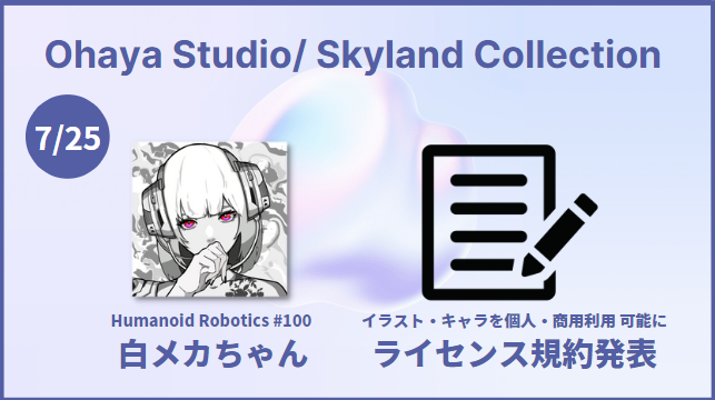 Skyland Ventures(本社:東京都渋谷区、パートナー・CEO:木下慶彦、以下SV)と、NFTクリエイターおはや @StudioOhaya (以下おはや) が共同で運営するNFTコレクション「OhayaStudio/Skyland Collection」( https://opensea.io/collection/the-double-face ) におけるHumanoid Robotics(通称メカシリーズ) #100の公開を記念し、NFTコレクションのライセンス規約を制作・公開しました。