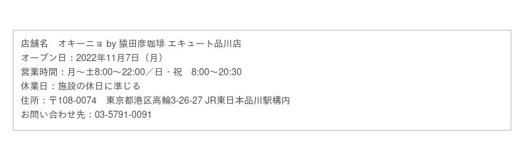 猿田彦珈琲株式会社(本社:渋谷区/代表取締役:大塚朝之)が運営する猿田彦珈琲は、2022年11月7日(月)より、ベーカリーブランド「オキーニョ」の常設店舗を、JR品川駅に直結しているエキナカ商業施設「エキュート品川」にオープンいたします。