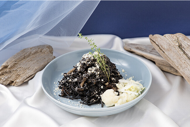 竹炭を使用した黒いトマトソースのパスタです。