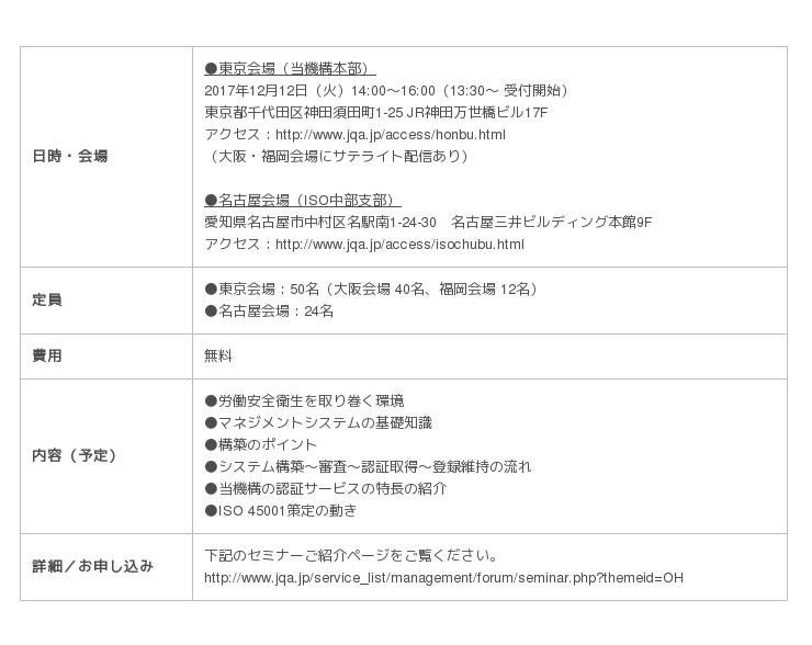当機構で開催している「労働安全衛生マネジメントシステム入門セミナー(無料)」では、ISO 45001の規格概要についてもご紹介しています。