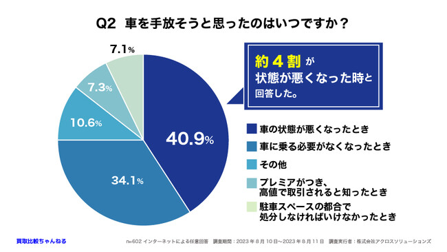 最も多い回答が「車の状態が悪くなったとき」で40.9%、次点で「車に乗る必要がなくなったとき」で34.1%でした。