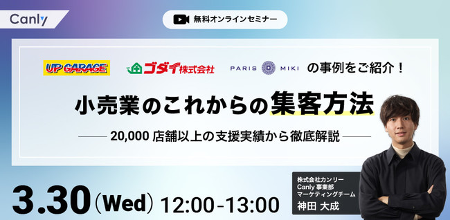 Googleビジネスプロフィール(旧・Googleマイビジネス)・HP・各SNSの一括管理サービス「Canly(カンリー)」の開発・提供を行う株式会社カンリー(所在地:東京都渋谷区、代表取締役:辰巳 衛,秋山 祐太朗)は、2022年3月30日(水)に『小売業のこれからの集客手法〜20,000店舗以上の支援実績から徹底解説〜』を開催することとなりましたのでご案内いたします。