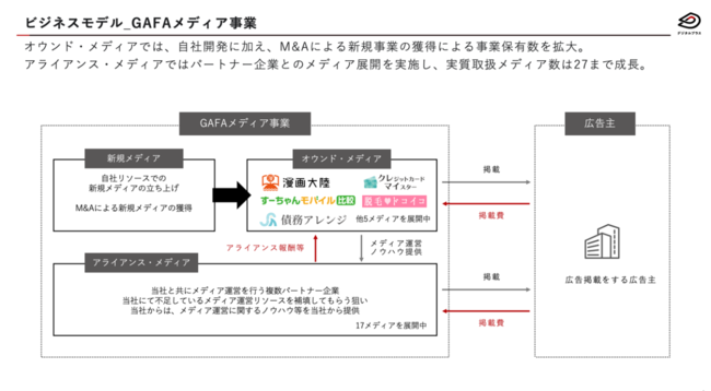 当社のGAFAメディア事業部では、EBITDA率70%以上を維持しながら、効率的に自社でのメディア立ち上げやM&Aでの新規獲得、パートナー企業との提携等の手法を用いて運用メディア数の拡大を目指しています。