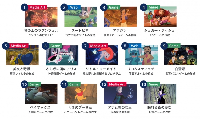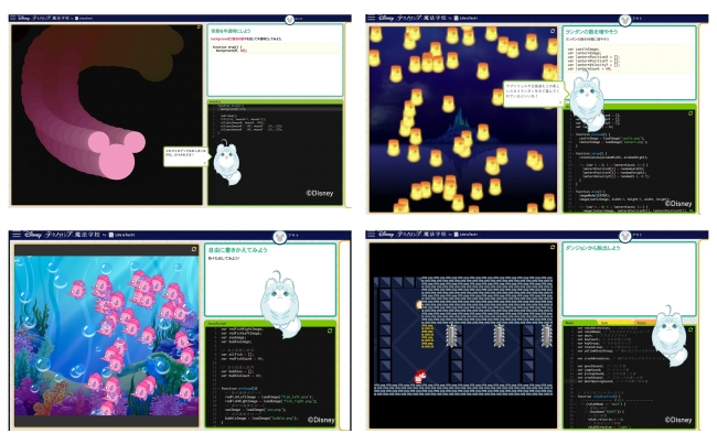 「テクノロジア魔法学校」は『プログラミングは現代の魔法である』をテーマとして、魔法学校を舞台にしたオリジナルメインストーリーと、『アナと雪の女王』『アラジン』など13のディズニー作品を使ったレッスンによって、ロールプレイングゲームのように冒険の物語を進めながらプログラミングを学ぶことができるオンライン学習教材です。