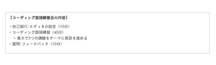 コーディング面接練習会は60分間のオンライン形式での実施となります。