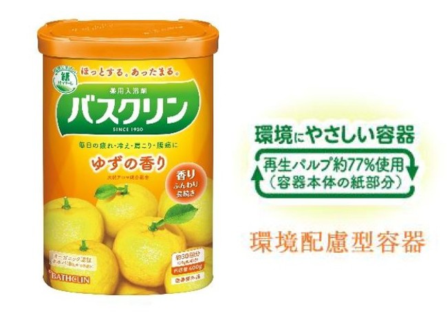 バスクリンの行う環境への取り組みのひとつとして、入浴剤「バスクリン」は、1999年から容器本体の紙部分の約77%に再生パルプを使用するなど、環境配慮型の容器を採用しています。