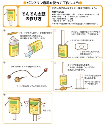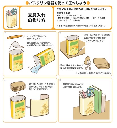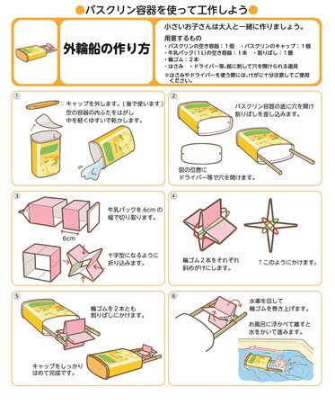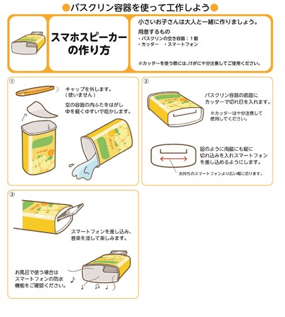 「バスクリン」容器の水に強い特長や加工のしやすさを活かした、お風呂で遊べるおもちゃや便利アイテムなどの再利用工作を通じて、知育や親子のコミュニケーションをサポートします。親子で楽しみながら再利用の大切さも伝えられる、お子様の夏の自由工作として、ぜひお試しください。