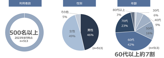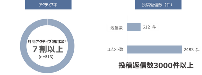 2022年12月の導入から8か月でユーザー数500人を突破しました。利用者のうち、60代以上のシニア世代が7割以上を占めますが(図1)、月間アクティブ利用率※は約7割と高く、投稿・返信数も3,100件以上となりました(図2)。住民間の気軽で日常的な情報交換が頻繁になされています。