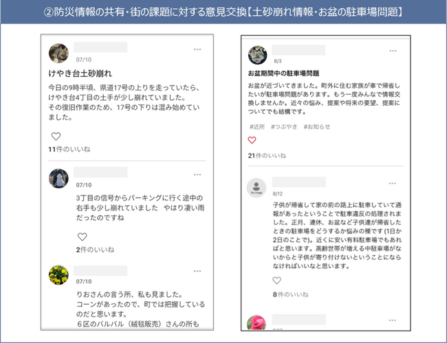 GOKINJOは、使いやすい・使いたくなるUI/UXを追求し、これまで導入したマンションや自治会で、幅広い世代で高い利用率・高い満足度を獲得している実績があります。子育て情報の交換、シニアによる植物や趣味の写真投稿など、私たちは普段の気軽な情報交換やモノのシェアリングを通じて、日常の気軽な人と人とのつながりを構築し、いざと言う時の共助にもつなげ、街や都市の防災力の向上にも貢献します。