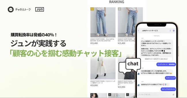 All-in-one顧客コミュニケーションツールの「チャネルトーク」(株式会社Channel Corporation、所在地:東京都中央区、CEO:玉川葉、以下「チャネルトーク」)は、株式会社ジュン(本社:東京都港区/代表取締役社長:佐々木進)が運営するECサイト「J'aDoRe JUN ONLINE(ジャドールジュンオンライン)、以下 ジュン」にチャネルトークを導入し、チャット接客を行い、転換率は実店舗並みの40%を記録し、アンケート調査では満足度驚異の85%を達成していることをお知らせします。