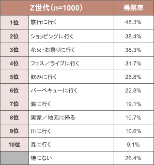 Z世代の「今後やりたいことランキング」は、「旅行」が1位!また、「花火・お祭り」「フェス・ライブ」といった夏ならではの行動も上位。