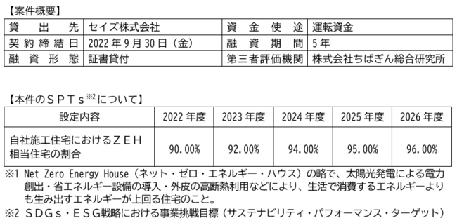千葉銀行(頭取 米本 努)は、2022年9月30日(金)、セイズ株式会社(代表取締役 及川 達也、本社:東京都葛飾区)に対して、「ちばぎんSDGsリーダーズローン(サステナビリティ・リンク・ローン型)」を取り組みましたのでお知らせします。