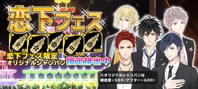 フェス限定オリジナルシャンパンを引き当て、club恋下で使用すると…最高クラスの親密度+500もアップするよ♪フェス中しか排出されない限定アイテムを是非ゲットして、彼と親密度を高めよう!