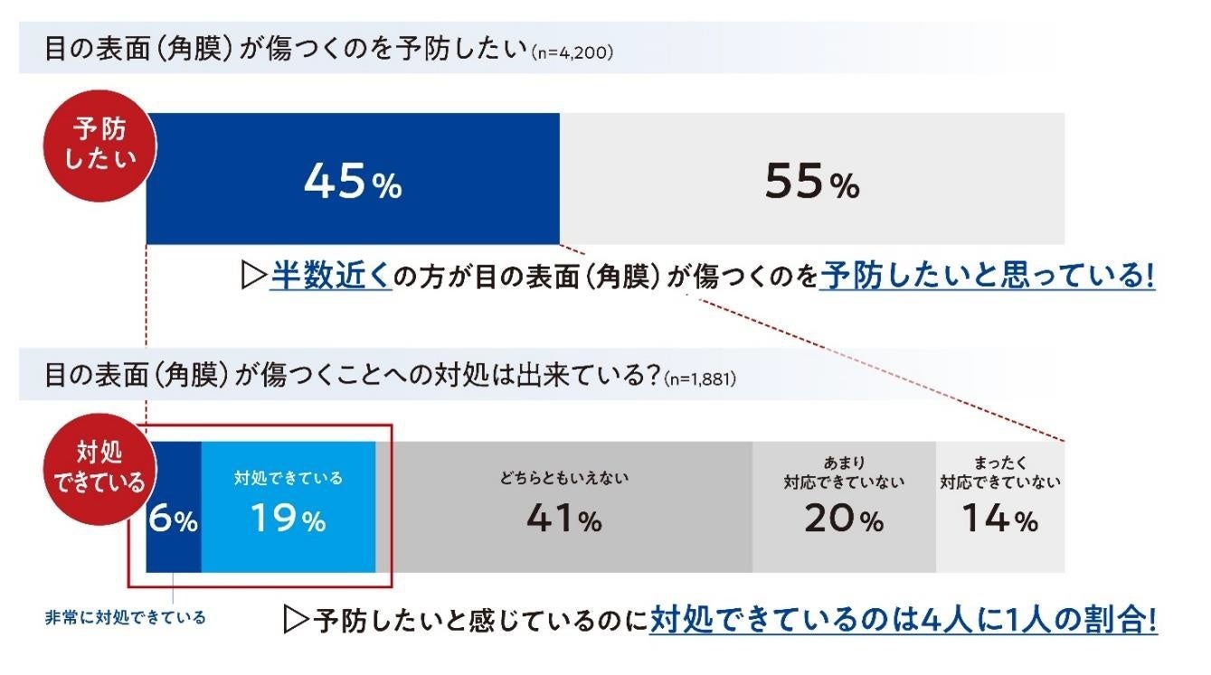 Santenが実施した調査によると、調査対象者の約半数が「目の表面(角膜)が傷つくことを予防したい」と考えている一方で、実際にその対策を講じている人は全体の約25%にとどまっていることが分かりました。