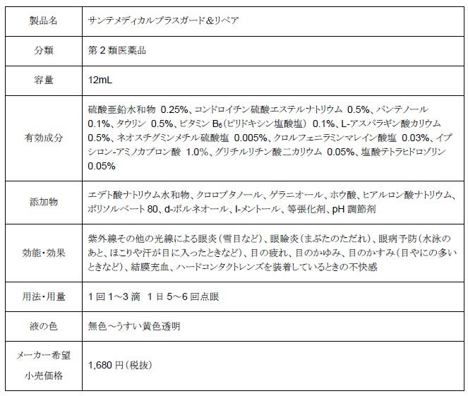 新発売となる「サンテメディカルプラスガード&リペア」「サンテメディカルガード&リペア」はいずれも、角膜ダメージ*?などによる目のヒリつき*? 、目の炎症(雪目など)*? に対応した製品で、角膜修復&バリア機能向上成分?である硫酸亜鉛水和物を承認基準内最大濃度*?配合。含まれる有効成分数や承認基準内最大濃度*?配合成分数が異なり、サンテメディカルプラスガード&リペアはサンテメディカルガード&リペアと比較して、組織代謝機能を持つパンテノールを0.05%→0.1%へ増量しています。