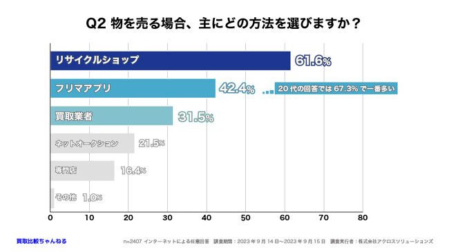 最も高い割合を示したのが「リサイクルショップ」で61.6%、次点で「フリマアプリ」が42.4%となりました。