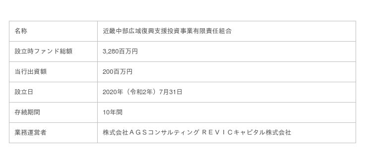 株式会社北陸銀行(頭取 庵 栄伸)は、株式会社地域経済活性化支援機構(以下「REVIC」という。)」のファンド運営会社であるREVICキャピタル株式会社及び株式会社AGSコンサルティングが共同で設立した「近畿中部広域復興支援投資事業有限責任組合」(以下「本ファンド」という。)へ出資を行うことを決定しましたので、お知らせいたします。