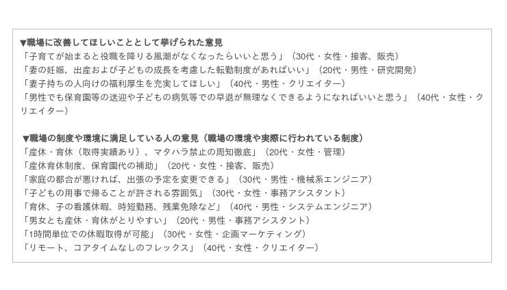 現在の制度や環境に満足している人以外の対象者に、職場に求める制度や環境を聞いたところ、「男性育児休暇取得の促進」(30代・男性・営業)、「リモートワークの推奨、フレックス制度の導入」(30代・女性・営業)といった制度の拡充のほか、「産休を取ったら迷惑がられたりする文化をなくす」(30代・女性・企画、マーケティング)、「従業員への周知や上司の理解不足が解消されること」(40代・男性・営業)といった、同僚からの理解や雰囲気といった職場環境の改善が多く挙げられました。制度があっても、取得することに対する周囲からの理解や円滑な業務の分担に課題が残る職場が多いようです。