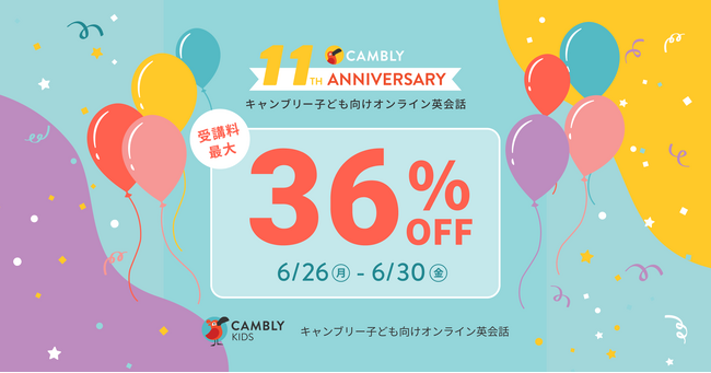 ネイティブ講師とのオンライン英会話サービス「Cambly(キャンブリー)」「Cambly Kids(キャンブリーキッズ)」を提供するCambly Inc.は、おかげさまで6月に11周年を迎えました。11周年を記念して様々なイベント・キャンペーンを開催してきたAnniversary monthの締めくくりとして、最大36%オフの5日間限定セールを開催します!