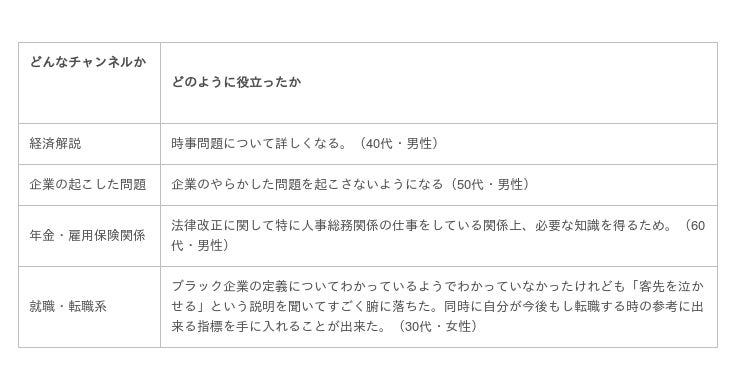 直接話を聞こうと尋ねると色々勧誘がうっとうしいし、YouTubeならすっ飛ばせるというか、距離があるためにリラックスした状態で話が聞きやすい利点が魅力だと思います。(40代・女性)