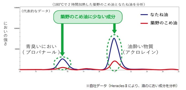 こめ油は油酔い物質と青臭いにおいの発生量が一般的なサラダ油と比較して少ないのが特徴です。揚げ物をすると周りに油のニオイが立ちこめて、気分が悪くなったり食欲がなくなったりする「油酔い」と言われる状態になります。こめ油はこれらの発生量が少ないので、快適に調理ができ、イヤなニオイが充満しにくいです。髪や服にもニオイがつきにくいので調理をしている方も快適です。