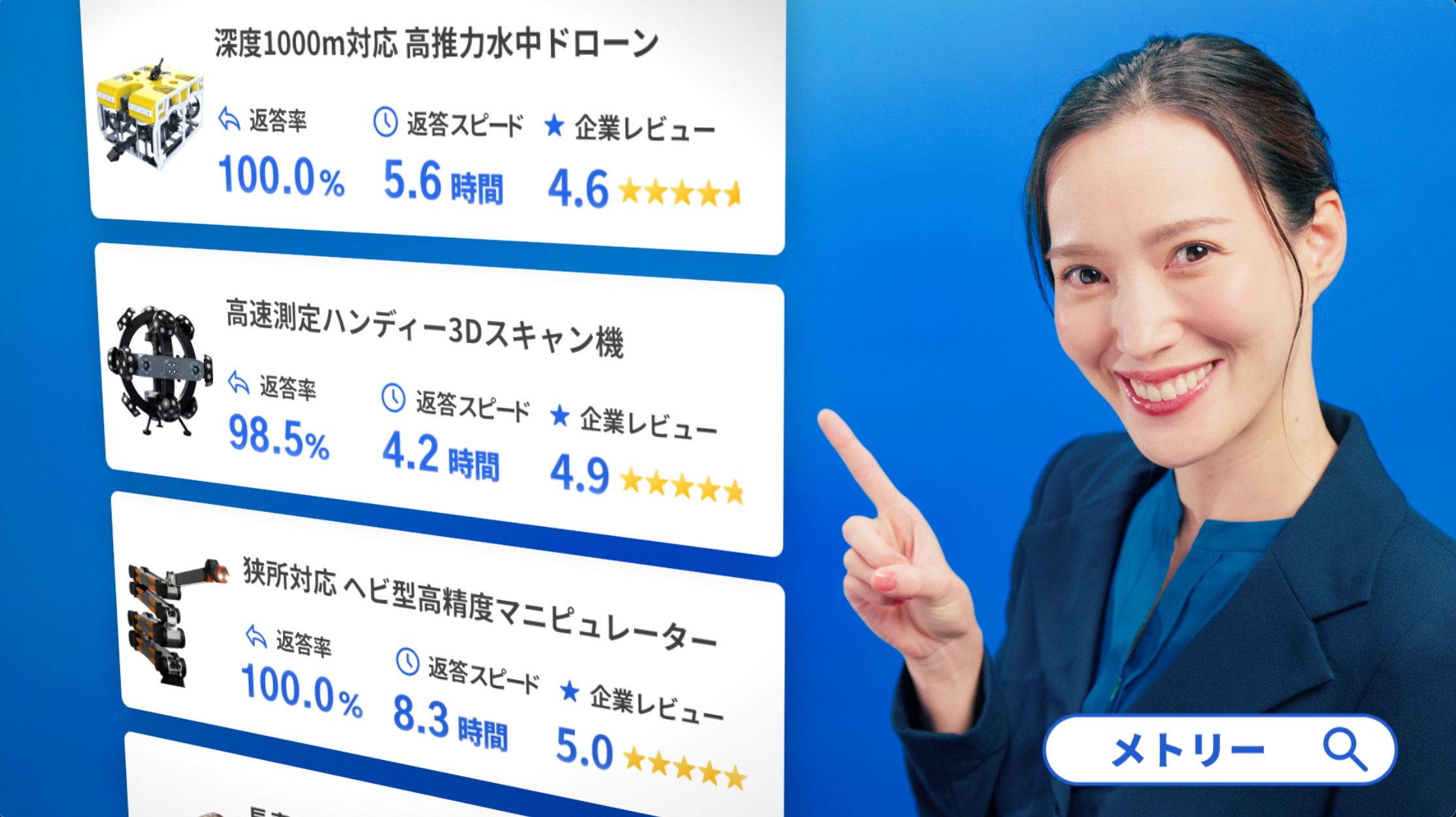 メトリーは、日本最大級の産業用製品検索サービスです。今回の新CM「産業用製品を探すならメトリー!編」では、50万以上の幅広いラインナップから最適な製品を探せる点、利用者が簡単に企業レビューを比較できる点など、サービスの利便性と魅力を視覚的に伝えることを目的としました。