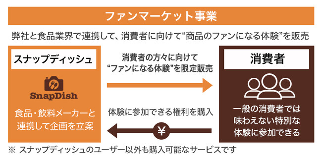 弊社は、食品・飲料メーカーが、商品モニターやキャンペーンなどを通じてユーザーにオンライン/リアルで商品を体験してもらうことができる「ファンマーケティング事業」と、弊社と食品業界の方々で連携して、消費者の方々に向けて“ファンになる体験”を販売する「ファンマーケット事業」の2つのビジネスモデルを展開しています。