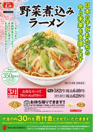 「餃子の王将」を運営する株式会社王将フードサービス(京都市山科区/代表取締役社長 渡邊 直人)は、3月限定で「野菜煮込みラーメン」を販売します。