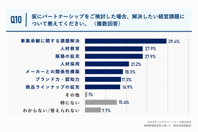 「Q10.仮にパートナーシップをご検討した場合、解決したい経営課題について教えてください。(複数回答)」(n=104)と質問したところ、「事業承継に関する課題解決」が39.4%、「人材教育」が27.9%、「販路の拡充」が27.9%という回答となりました。